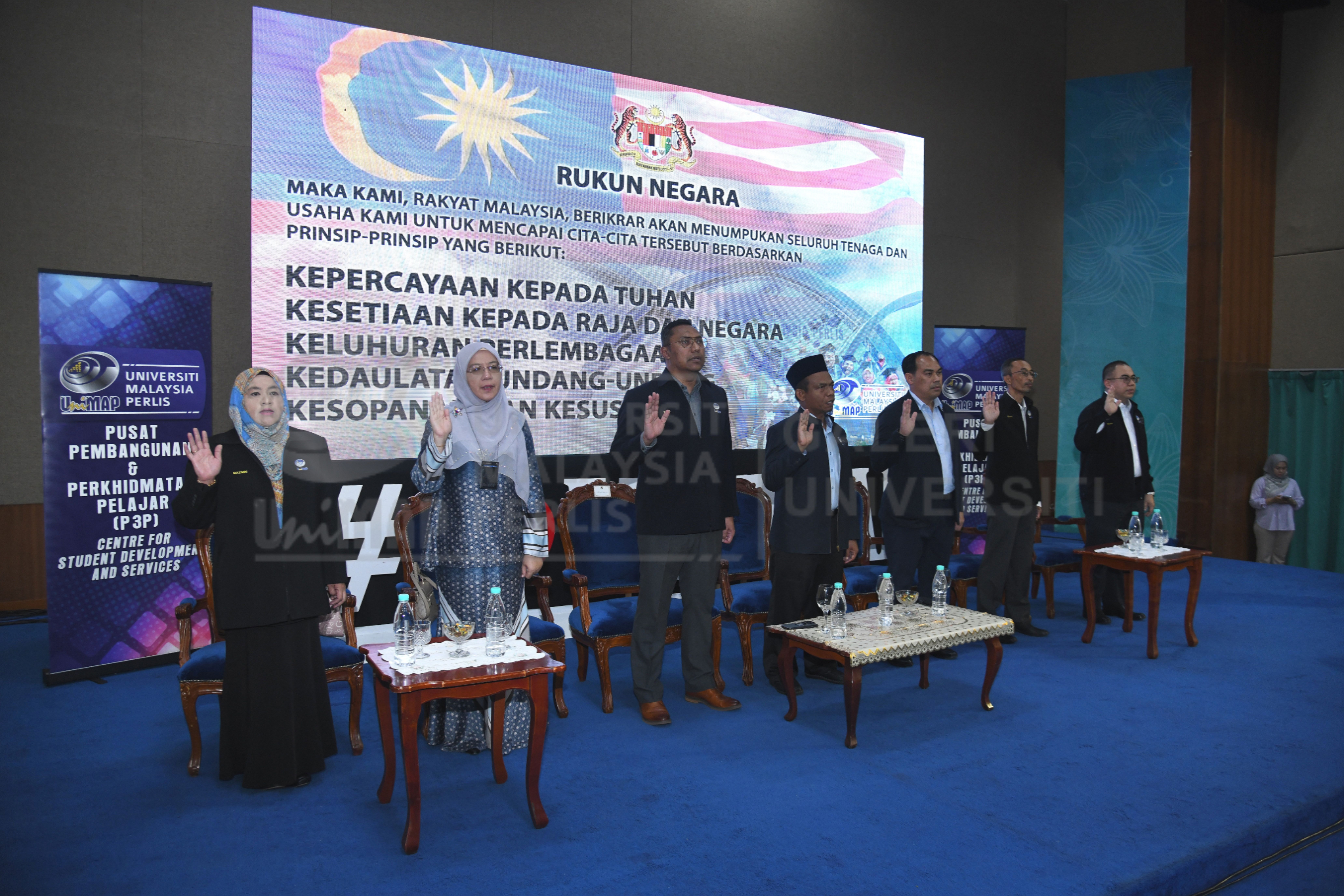 Abstract: Sesi bacaan ikrar Rukun Negara. Pegawai-pegawai utama UniMAP turut hadir pada Majlis Sambutan Siswa Siswi ambilan Diploma Sidang Akademik 2023/2024 sempena Minggu Suai Kenal (MSK) pada 24 Julai 2023 yang berlangsung di Dewan Kecemerlangan Kampus Alam UniMAP, Pauh Putra. Di dalam gambar; Puan Hajah Mazmin Mat Akhir, Cik Norsyahiza binti Hamzah, Prof Ir Dr Rizalafande Che Ismail, Prof Dr Mohd Yusoff Mashor, Prof Ts Dr Mohd Mustafa Al Bakri Abdullah, Encik Rusdi Puteh, Encik Zainudin Zainon.