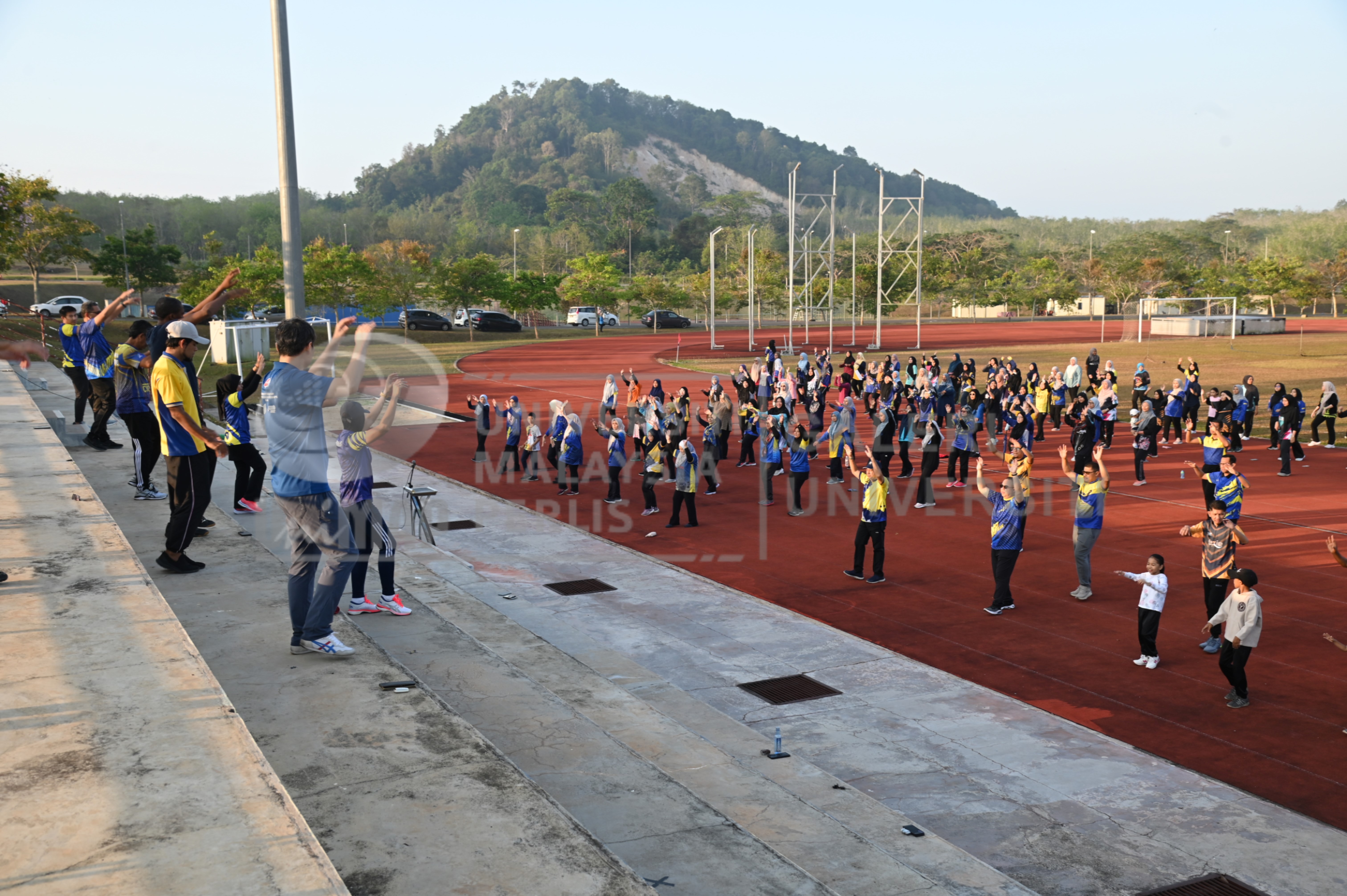 Abstract: Barisan instruktor senamrobik dan warga UniMAP yang menyertai Program Senamrobik bersama Naib Canselor dan Pengurusan Tertinggi UniMAP serta penyampaian hadiah dan Pra Pelancaran LEARN Ocupational Safety Health oleh COSHE UniMAP. Turut bersama Yang Berbahagia Prof. Dato' Ts. Dr. Zaliman Sauli, Naib Canselor UniMAP, Puan Mazmin Mat Akhir, Ketua Pustakawan UniMAP, dan Encik Zainudin Zainon, Penasihat Undang-Undang UniMAP.