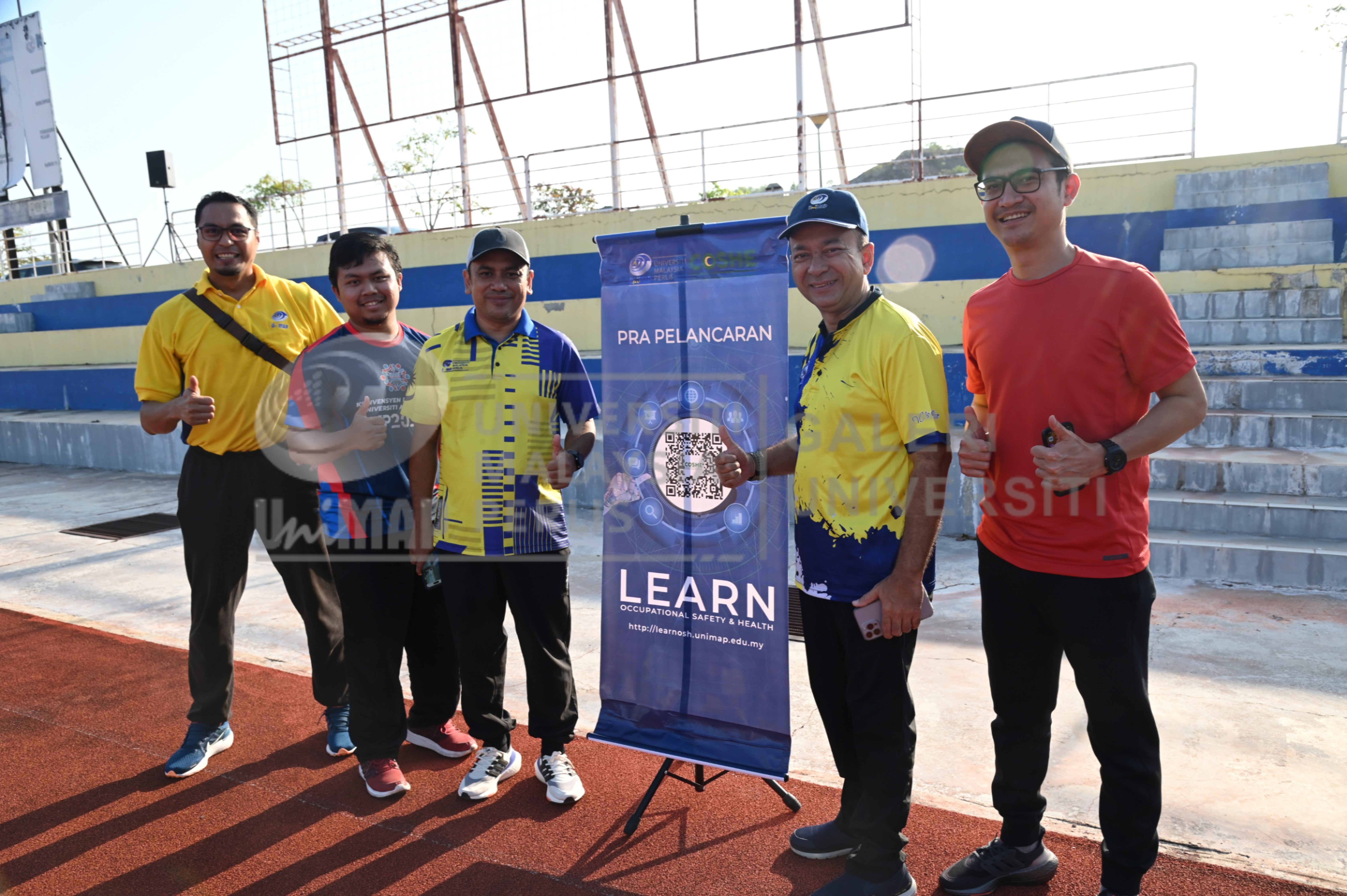 Keywords: | Yang Berbahagia Prof. Dato' Ts. Dr. Zaliman Sauli;Naib Canselor UniMAP;Encik Norazam Bin Abdul Rashid;Pengarah Pusat Pengurusan Keselamatan, Kesihatan & Persekitaran Pekerjaan;Encik Shah Rizan Bin Mohd Rejab;Encik Mohd Robani bin Hasan;Encik Ahmad Luqman Afiq Abdullah | Issue Date: | 9-Mar-2023 | Type: | Image | Conference: | Program Senamrobik bersama Naib Canselor dan Pengurusan Tertinggi UniMAP serta penyampaian hadiah dan Pra Pelancaran LEARN Ocupational Safety Health oleh COSHE UniMAP | Abstract: | Sesi bergambar selepas Pra Pelancaran LEARN Ocupational Safety Health oleh COSHE UniMAP, yang telah disempurnakan oleh Yang Berbahagia Prof. Dato' Ts. Dr. Zaliman Sauli di Kompleks Sukan Syed Sirajuddin Areeb Putra pada 9 Mac 2023. Turut bersama Encik Norazam Bin Abdul Rashid (Pengarah Pusat Pengurusan Keselamatan, Kesihatan & Persekitaran Pekerjaan), Encik Shah Rizan Bin Mohd Rejab, Encik Mohd Robani bin Hasan, dan Encik Ahmad Luqman Afiq Abdullah. | URI: | http://hdl.handle.net/20.500.14258/1641 | Rights: | Kompleks Sukan Syed Sirajuddin Areeb Putra, Kampus Alam UniMAP, Pauh Putra |