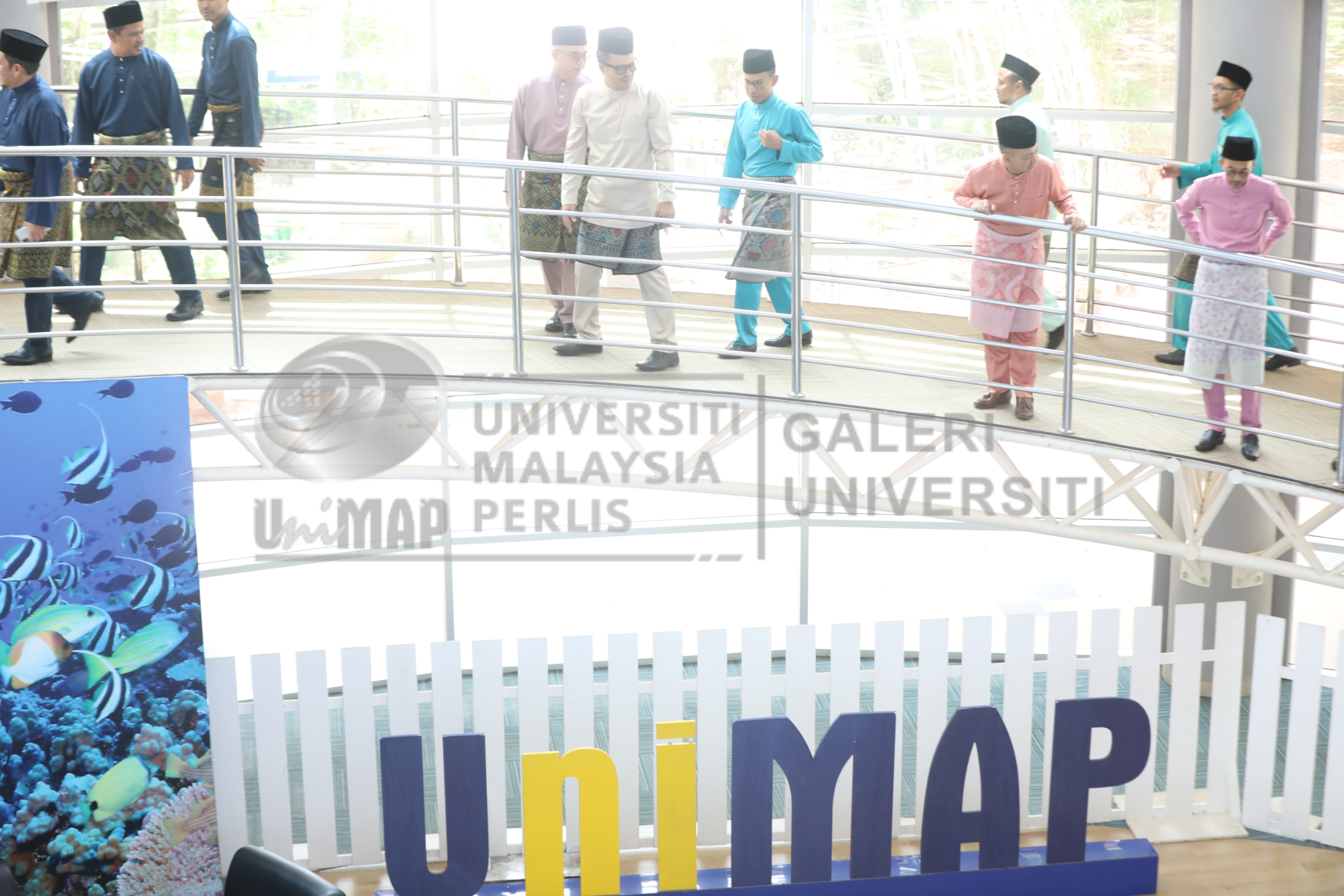 Abstract: YBhg. Prof. Dato' Ts. Dr. Zaliman Sauli, Naib Canselor Universiti Malaysia Perlis (UniMAP) bersama-sama dengan pengurusan tertinggi universiti, dekan fakulti, ketua jabatan dan kakitangan UniMAP yang terlibat berjalan menaiki "spiral ramp" ke aras atas PTSFP untuk memulakan Sesi Rakaman Takbir Raya Aidilfitri UniMAP di Perpustakaan Tuanku Syed Faizuddin Putra (PTSFP), Kampus Alam UniMAP, Pauh Putra.