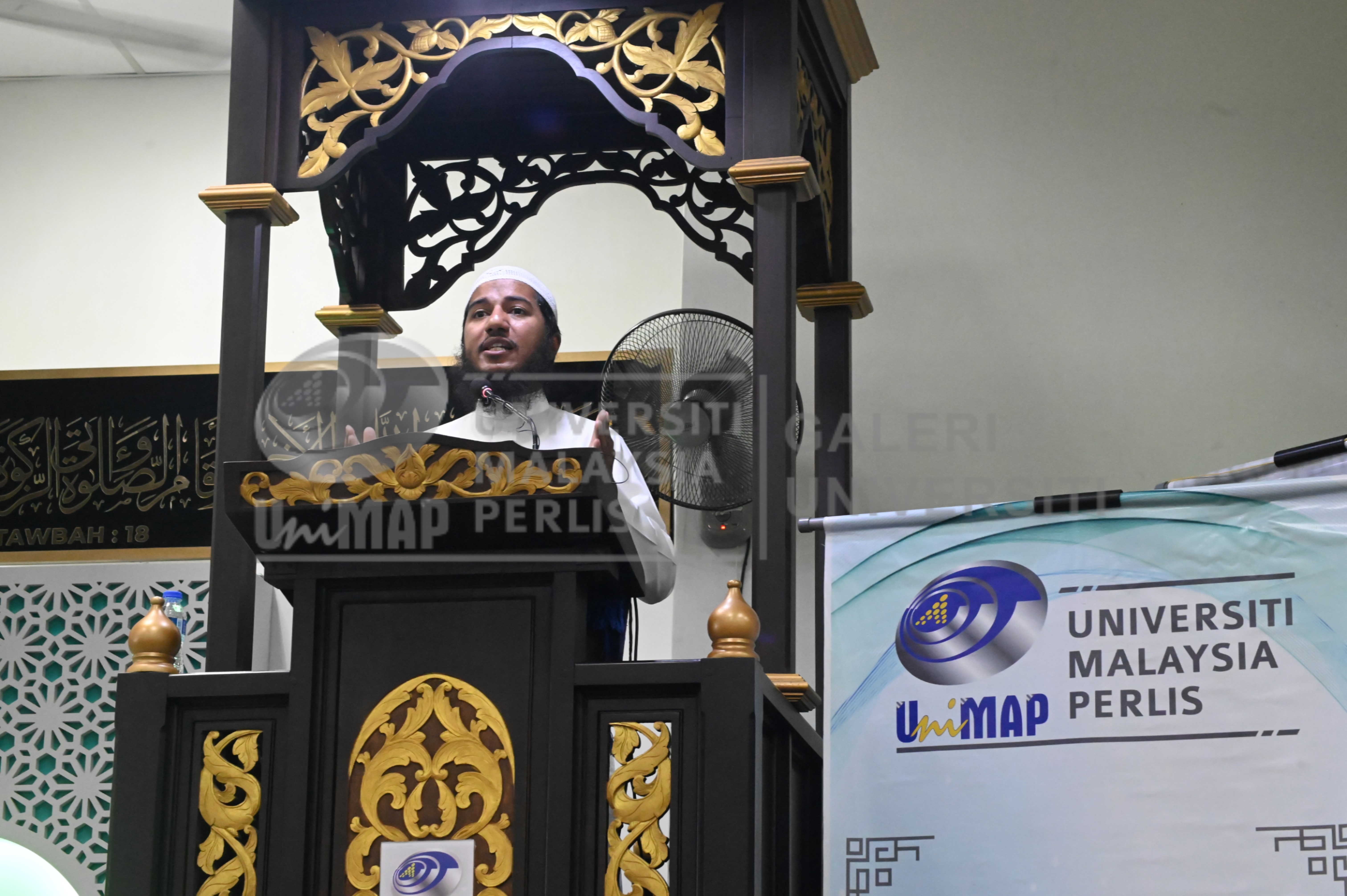 Abstract: Shaikh Fariq Naik sedang menyampaikan Khutbah Jumaat Khas yang berlangsung di Surau Kampus Alam UniMAP, Pauh Putra pada 24 Januari 2025.