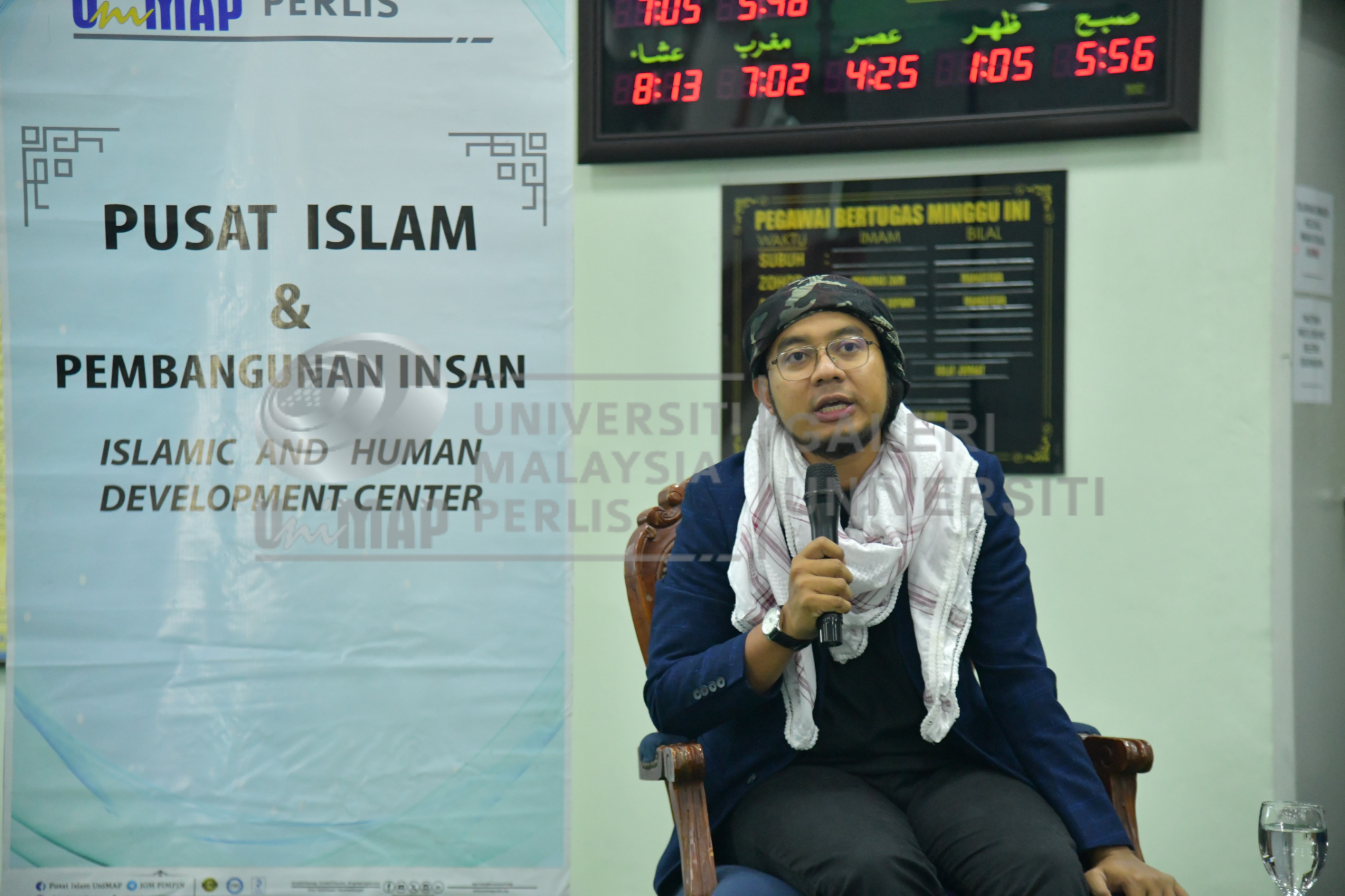 Abstract: PU Rahmat, aktivis dan juga peserta Sumud Flotilla sedang berkongsi pandangan sempena Wacana Isu Semasa Sumud Flotilla: Solidariti Taruhan Nyawa Demi Agama pada 24 Oktober 2025 di Surau Pauh Putra, Universiti Malaysia Perlis (UniMAP).